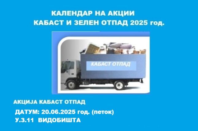Ј.П.„Охридски Kомуналец” на ден 20.06.2025 год.(петок) ќе организира акција за подигнување кабаст отпад (стар мебел, душеци, телевизори, шпорети, теписони и др.) У.З.11 Видобишта.