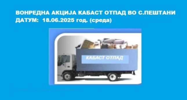 Се молат граѓаните од с.Пештани доколку имаат ваков отпад уредно да го депонираат најдоцна до 07.00 часот на 18.06.2025 година и претходно локацијата да ја пријават на дежурниот телефон 075-495-428, кој функционира секој ден во неделата во периодот 07.00 часот-21.00 часот.